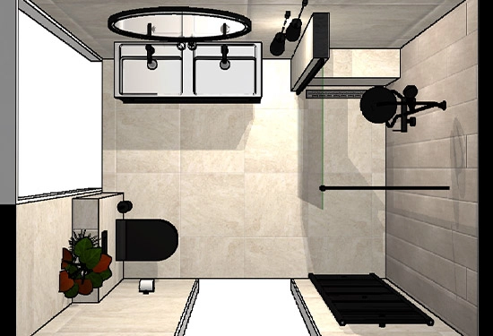 De kleur zwart is tot in de kleinste details doorgevoerd in deze badkamer. Gecombineerd met tegels in warmere tinten krijg je een aangename sfeer. Deze fijn sfeer past goed past bij het comfort dat deze badkamer ook biedt. Met dit ontwerp geniet je ook van het gemak van een zitje in de douche, een fijne grote spiegel en mooie opbergruimtes voor je chicste badkamerspulletjes.